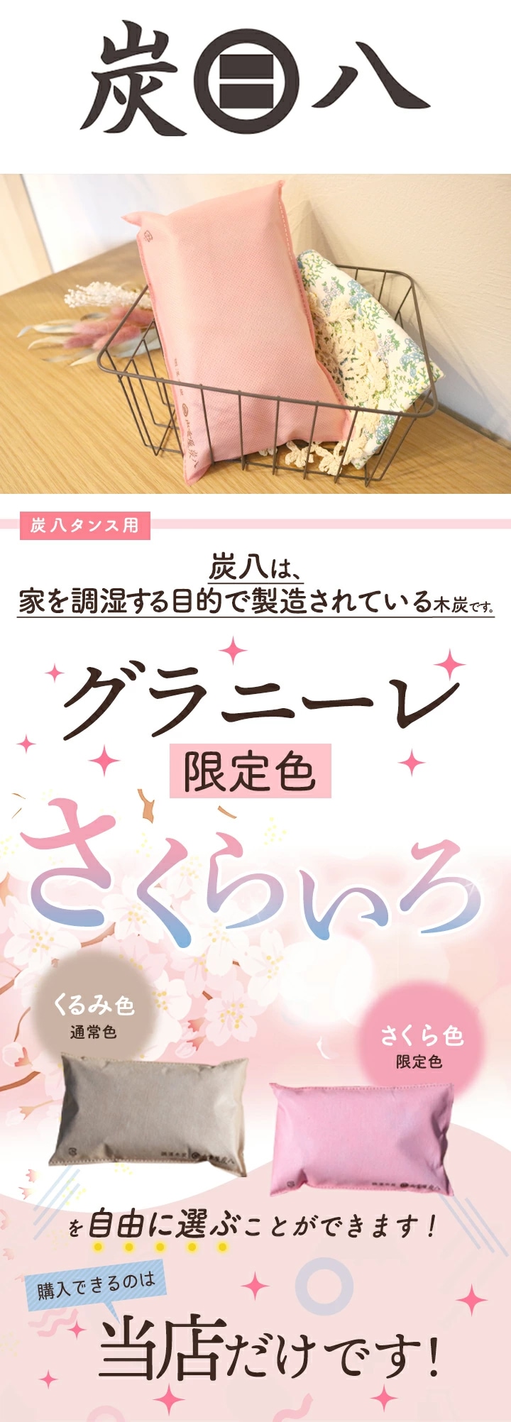 炭八がお気に入りで、除湿剤から炭八に切り替え中です。くるみ色も持っていますが、こちらの店舗でしか買えないさくら色がとても可愛いです!機能はもちろんですが、やっぱり可愛い方が断然良いですね。次は押入れ用のさくら色を購入したいと思っています。 -