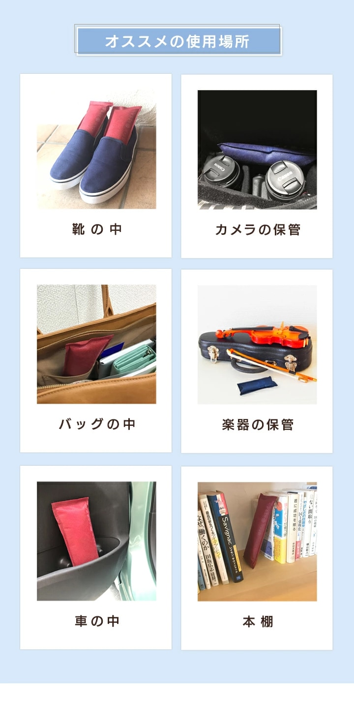 カメラケース、マイクケース、スーツケース、ギターケース、ベースケース、ピアノ、電子ピアノ、バイオリン、三味線、一眼レフカメラケースなど湿気を嫌うデリケートなものに、引き出しの中、本棚、車の座席下、ランドリールーム、座布団の間、靴の中、寝具の隙間、衣装ケース、タンス、バッグの中、ぬいぐるみの保管、キッチンのパントリー、食品庫、収納棚、吊り戸棚、床下収納、水回りの収納棚、トイレ etc..