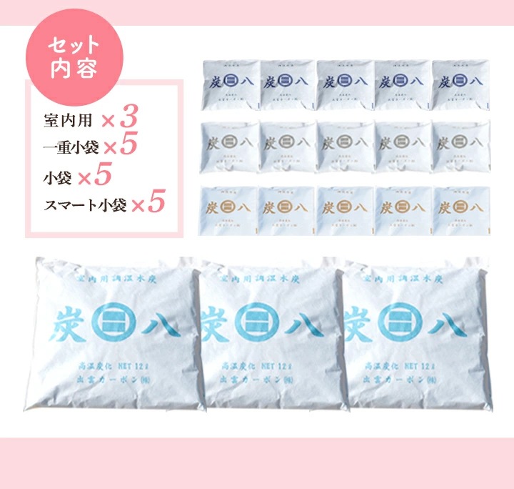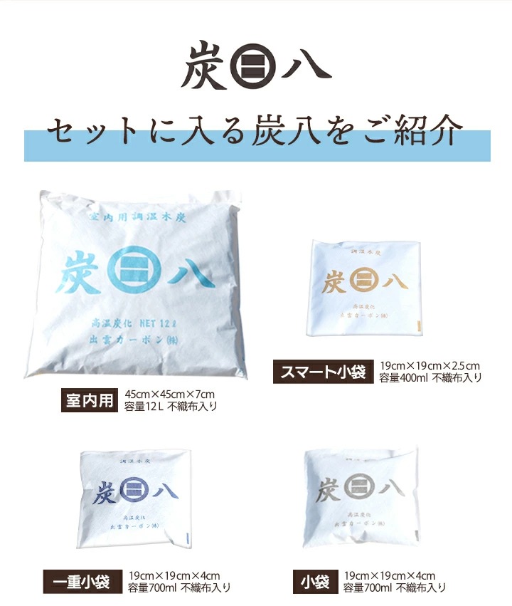「炭はち(すみ八)木炭調湿材シリーズ」は、湿気や臭いの悩みを解決する湿気対策グッズとして、多機能で便利なアイテムです。