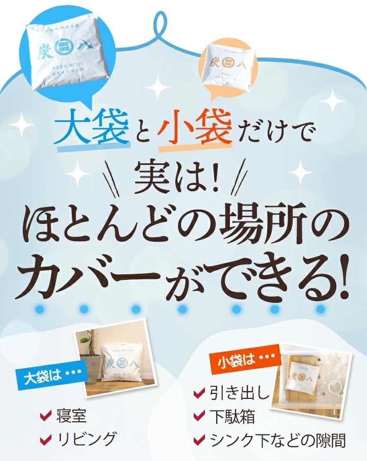 お客様のご意見を取り入れ、不織布が一重の「床下用炭八」を、中の炭が漏れにくくするため不織布二重にして「室内用炭八」として販売を開始しました。安心してご利用いただけます。