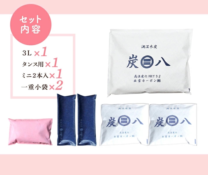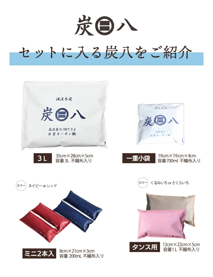 「炭はち(すみ八)木炭調湿材シリーズ」は、湿気や臭いの悩みを解決する湿気対策グッズとして、多機能で便利なアイテムです。