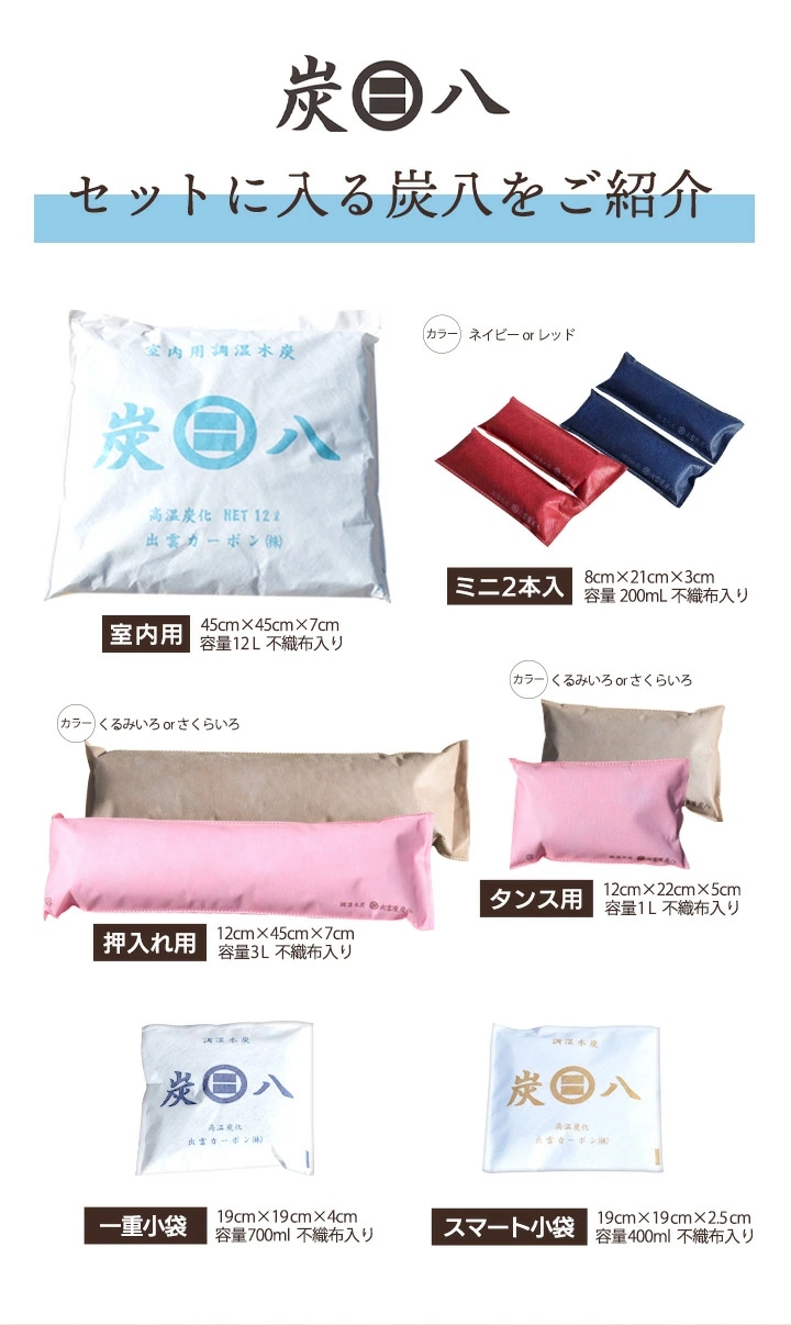 「炭はち(すみ八)木炭調湿材シリーズ」は、湿気や臭いの悩みを解決する湿気対策グッズとして、多機能で便利なアイテムです。