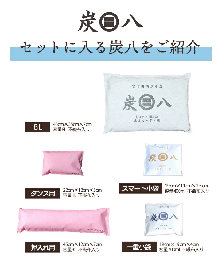 「炭はち(すみ八)木炭調湿材シリーズ」は、湿気や臭いの悩みを解決する湿気対策グッズとして、多機能で便利なアイテムです。