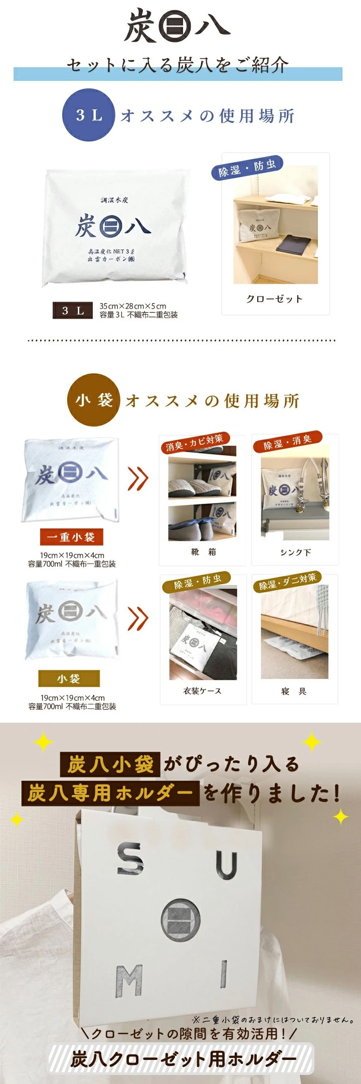 「炭はち(すみ八)木炭調湿材シリーズ」は、湿気や臭いの悩みを解決する湿気対策グッズとして、多機能で便利なアイテムです。